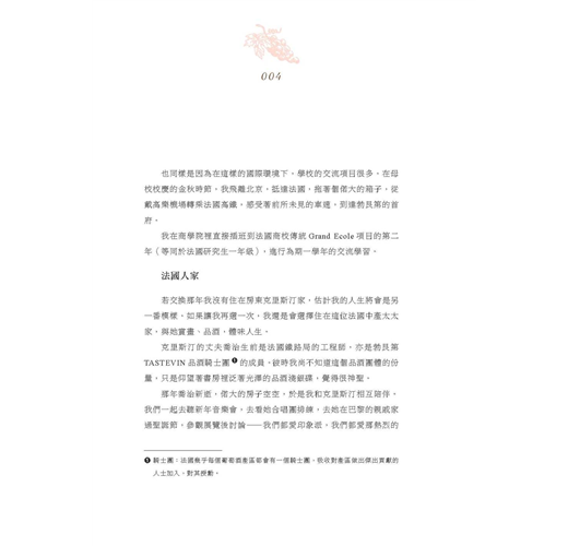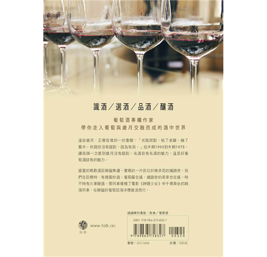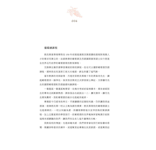 稚嫩的幼芽經歷風霜、開花結果,最終在釀酒桶中涅槃成酒汁;香醇的酒汁經過黑暗中時間的發酵,再安靜地沉寂一些時間後,終於落到你我杯中,用變化萬千的口感香氣,帶來舒適的微醺:這是生命的約定、綻放和終結;我也總是愛讀葡萄酒的歷史,這裡有智慧,有戰爭,有整個世界史—在這裡看成敗、見興替,也是如鏡。是這樣廣博的葡萄酒形成現在的我:喜歡小啜和微醺,被葡萄酒感動,然後寫酒,既而被各種酒文感動,不過紅塵一痴人。