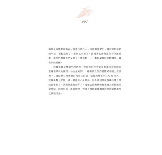 我選擇葡萄酒,起初是為了尋找一個夢想和現實的平衡點—就像葡萄酒,太淡太濃都不算好酒,平衡是一個好酒首先要達到的標準。所有人都在尋找一個和心中夢想最近的那個平衡點,而葡萄酒,就是我調淡現實、加濃理想的平衡點。不過我幸運地發現,這個平衡點其實離我最初的夢想很近很近,葡萄酒的廣度和深度,讓這個世界值得萬般品味。