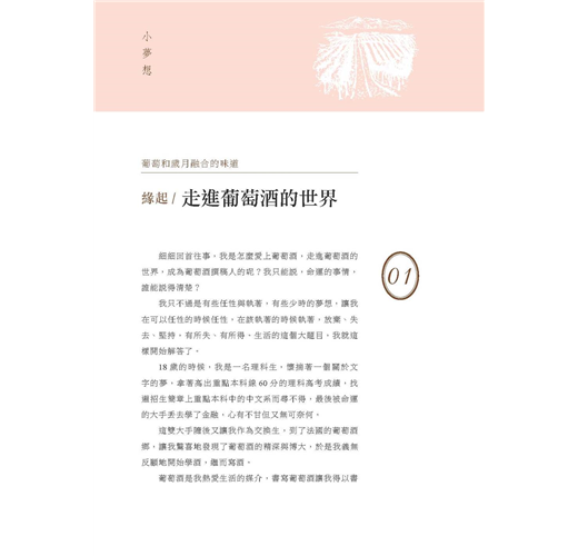 我選擇葡萄酒,起初是為了尋找一個夢想和現實的平衡點—就像葡萄酒,太淡太濃都不算好酒,平衡是一個好酒首先要達到的標準。所有人都在尋找一個和心中夢想最近的那個平衡點,而葡萄酒,就是我調淡現實、加濃理想的平衡點。不過我幸運地發現,這個平衡點其實離我最初的夢想...