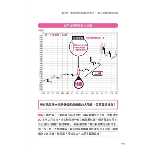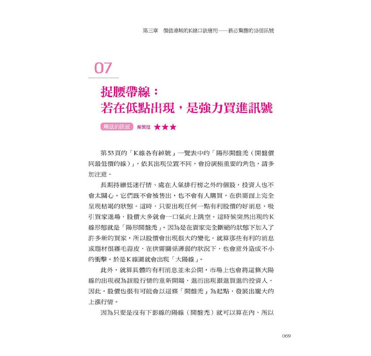 當了解K線的基礎後,就有如學功夫前的蹲馬步,一旦馬步扎得穩,那麼之後所練的各種武功招式,都可以充分發揮威力。第三章〈價值連城的K線口訣應用〉就是講解各種K線的實務運用,每一招都有其實質的意義,希望讀者不要囫圇吞棗、一下就讀過,把每一招都拿來用在台股上,好好對照一番,看看在台股的實務應用上會有如何變化。