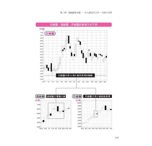 在某些K線的書籍會提到,K線就是要以日為單位來看。因為K線最早就是為了分析每日價格的變動,而開發出來的方法。其他像是週線圖或月線圖等,都只是日線圖的衍伸應用、援用而已。