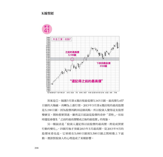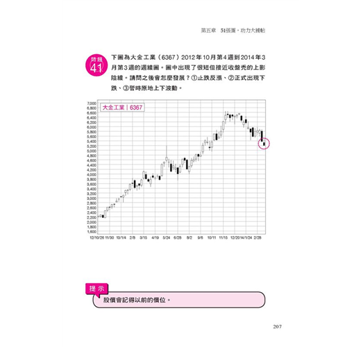 第五章就是作者提供大家練習的測驗題,共有51 道題,這是驗證自己的功力是否已經大增的部分,一樣建議各位讀者,要確信自己已經學完一到四章的內容,再來讀第五章。因為第五章就有如模擬考一樣,如果還沒看完書就去偷瞄模擬考的題目,只會喪失模擬考的功能──「檢驗自己的學習成果」,這樣到實際大考時(進場實際交易),就必須拿真金白銀來學習,成本就會昂貴許多了。