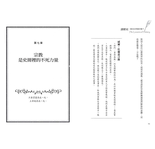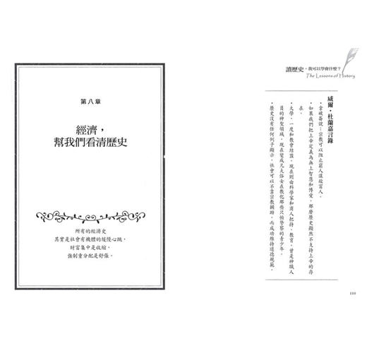 ◎「研究歷史有何用處?只是聊些城邦興亡、理念的消長,並重述些君王崩殂的悲慘故事」嗎?對此,威爾.杜蘭指出: