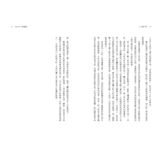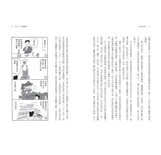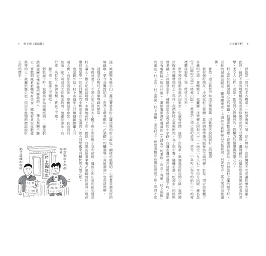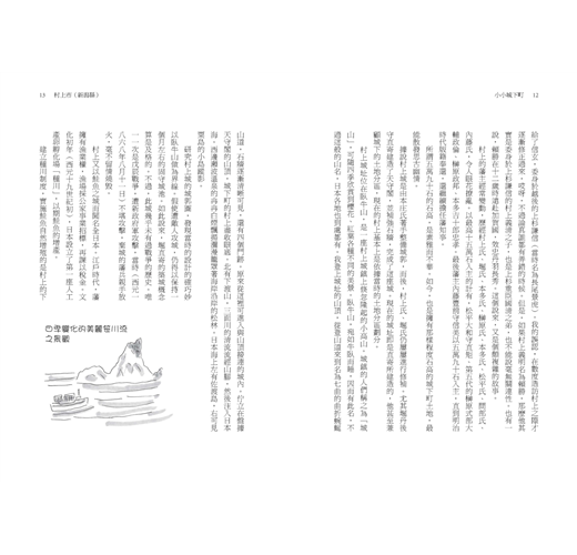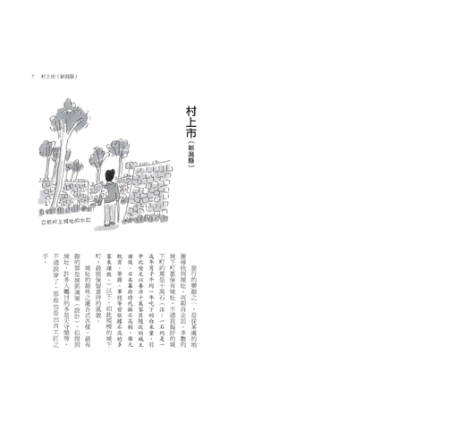 以領主居住的城堡為核心所建立的城市,稱之為「城下町」。安西水丸旅行的樂趣之一,是從某處的地圖尋找到城址,再親自走訪。而十萬石以下的小小城下町,最能吸引他的注意,因其保留且形塑當時歷史。不論是住宅屋舍、神社佛閣、人們的起居生活、慶典,或是靜默佇立的城址: