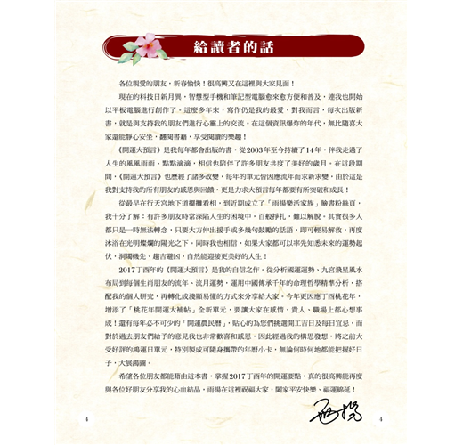 我多年來悉心撰寫十二生肖運勢,就是為了預知星曜的變化,乘著吉星之力飛揚,並提防凶星可能帶來的運勢波折。俗話說:「知己知彼,百戰百勝」,希望各位朋友都能掌握自身生肖在丁酉年的運勢起伏,把握機緣、避開險惡,進而平安、如意的度過此年,前途必然光明無限!
