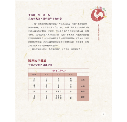 民國106 年,西元2017 年立春八字如下:丁酉、壬寅、辛酉、庚子,正月辛金本身為衰弱之金,於寅月子時更偏於寒冷,天干庚金更添寒意,雖有丁火仍不能解其寒,加之年柱天地相剋,代表本年將有天地不合的跡象,引發大自然帶來更多的災害,需特別小心提防。尤其下半年在天災上易有大水、寒害、風寒、凍傷方面的問題,特別提醒居住或工作在低窪地區的朋友,如有豪雨特報時要特別小心,最好能在平時就注意防範。另外,國家應嚴謹面對人才出走、醫院血荒及食安問題,關注長期隱...