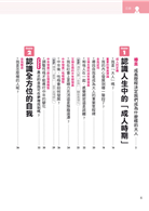 全書以符合台灣現況,探討成人各階段常見的心理問題:我愛你,但為什麼我們吵不停?人的一生到底追求什麼?如何才算是個成熟的大人?……等,用佛洛伊德、榮格、阿德勒等偉大心理學家的論點做為根據,深入點出問題、適切提出建議。心理學可培養正向思考、自我啟發,拿捏人我關係,甚至傳授說話技巧,對心理學了解愈多愈透徹,面對人生的難關愈能處之泰然、展現高EQ。閱讀本書歡迎對號入座,唯有坦然面對、正視成為大人後的自己,才能為自己的人生開始新的一頁。