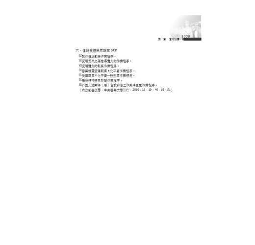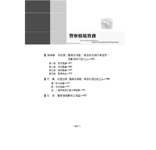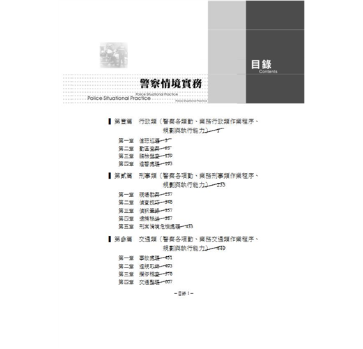 警察情境實務是一門綜合性應用學科,亦即警察在執行勤務時面臨的各種狀況,做出情境之判讀和處置。因此,必須對警察專業知識有所瞭解,才能有效運用於實務之操作。本書基於實用性,係以警察法令為體(基礎),以實務操作標準作業程序為用(運用)。以情境實務觀點探究其實際操作處理之程序與勤務規劃、執行之能力,且附有情境模擬狀況俾供讀者演練,提供最佳指引之方向。