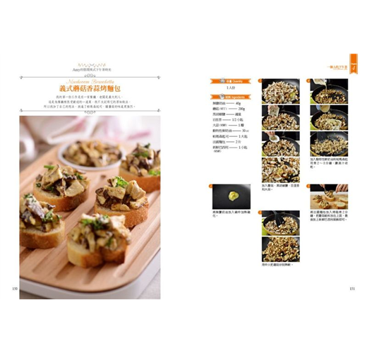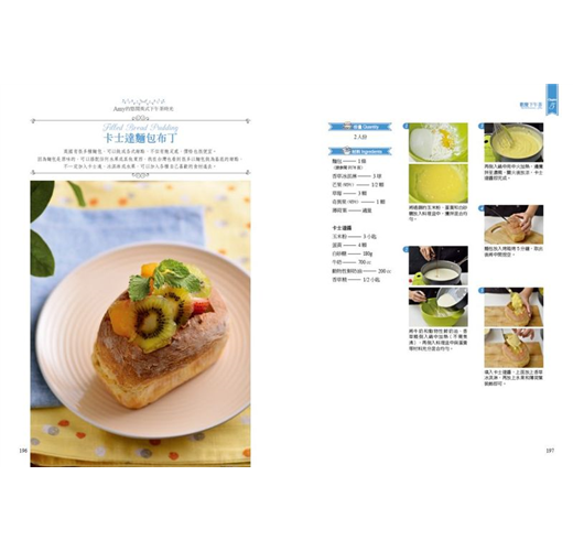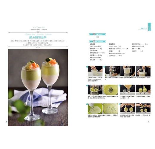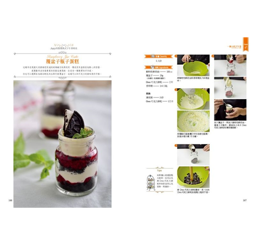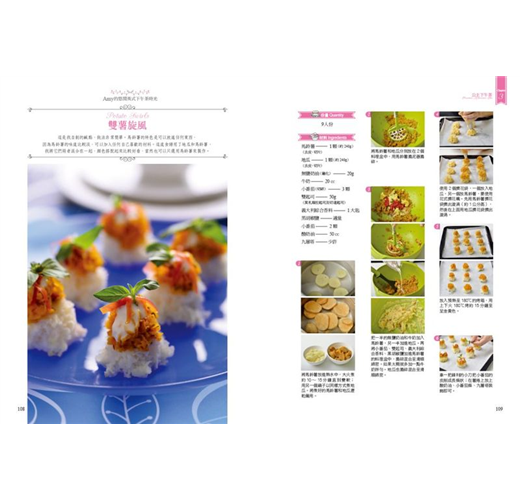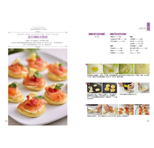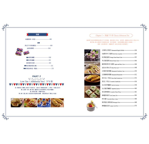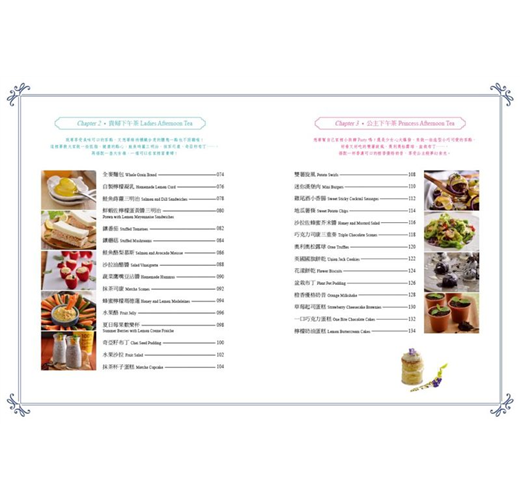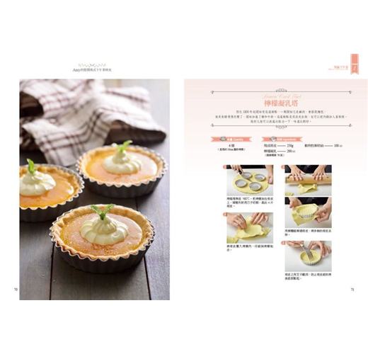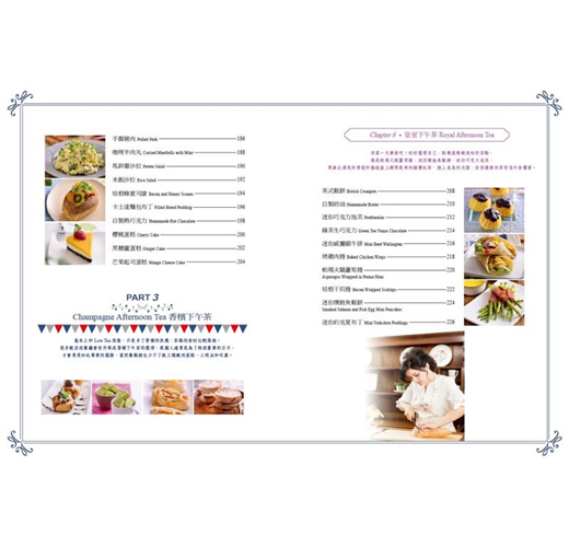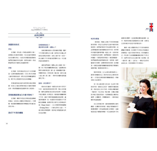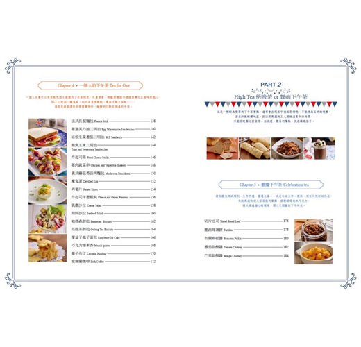 傳統英式下午茶三層點心架,最下面一層是三明治和其他鹹點,中間是司康和餅乾,最上層是各式蛋糕和甜點,本書43道甜點+42道鹹點+10道醬料+5道飲料一次教給你。最特別的是Amy還教你做各式醬料,貼心地告訴你利用醬料還可以做出更多變化的茶點。而下午茶不只可以喝紅茶,還可以搭配咖啡、奶昔或調酒,就讓Amy告訴你英國人常喝的下午茶飲料。