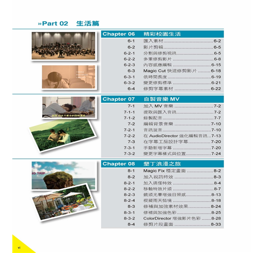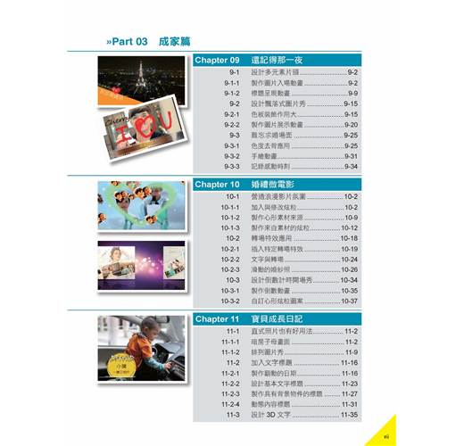 本書分為四篇共十三章,第一篇為修身篇,即立即掌握基本功能應用,將每個功能應用融入相關章節實例中,除瞭解影片製作過程,並學會快速製作影片的技巧,立即滿足一般性的應用;第二、三篇為生活與成家篇,為綜合應用篇章,依據人生必經的幾個重要階段,學習透過專業的、合適的技巧,分別製作成精彩的影片,有第三篇的校園生活、異性追求、愛中旅行、及第四篇的浪漫求婚、甜蜜婚禮、孩子成長等精彩甜蜜的過程;第三篇為立業篇,將工作中常會碰到的例子做成影片作品,例如數位履歷、產品教學與行銷服務等等,藉此將生活、工作、技能與學習結合為一,達到即學即用且不枯燥的應用學習目標。