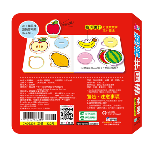紅紅大蘋果、黃黃彎香蕉、黃橙橙木瓜、綠綠大西瓜,好吃的水果任你挑。泡棉拼圖符合玩具安全檢驗,圓角設計寶寶不受傷,使用真安心。精美的水果圖案引起寶寶的興趣,2-4片拼圖符合寶寶此年齡的能力,讓孩子在拼圖過程中了解整體與部分的關係,學習分類組織的概念;拼圖塊上的凹洞方便寶寶拿取拼圖;底圖的相同圖案,讓寶寶初期經由對照的方式進行拼組,增加寶寶的成就感。與圓形插板的結合,讓水果圖案更立體,可進行扮演遊戲。透過剖面圖讓寶寶認識水果內部的樣貌。玩拼圖可激發小朋友推理思考能力並增進手眼協調能力,提高挫折忍受度,增加觀察力,培養耐心與專注力。內容包含蘋果、香蕉、木瓜以及西瓜,圖案簡單、色彩鮮豔,吸引小小孩的注意