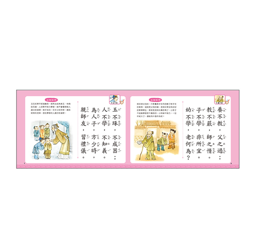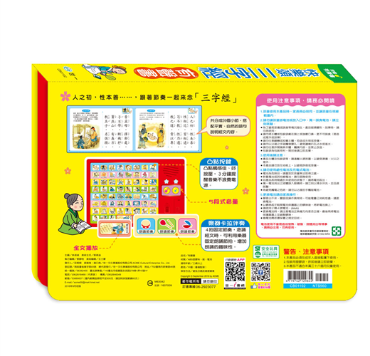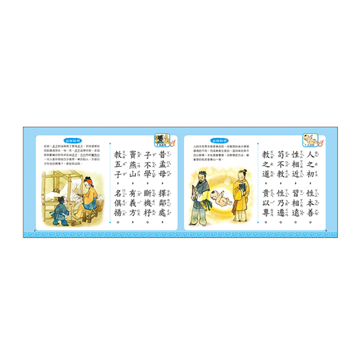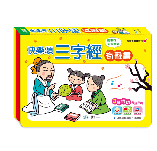 《三字經》是中國的傳統兒童啟蒙教材,取材包括傳統文化的文學、歷史、哲學、天文地理、人倫義理、忠孝節義等等,內容相當豐富。以輕快的節奏,搭配三個字為一句的念誦,讓孩子朗朗上口並增進對內文的記憶。