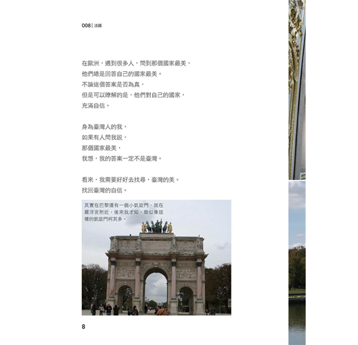 我在空服員廣播中醒來,此時的飛機正從黑壓壓的雲層中,向下俯衝衝出了雲層。從天空往下俯瞰,此時的巴黎是金光閃閃的巴黎,以凱旋門為中心是那一條條的輻射散出的公路,這一條條的光彩奪目的公路好像是要連到世界的盡頭;我能感受到這一段雄心壯志,有股帝國的氣概—有種普天之下,以為我中心,眾國皆要臣服於我的感覺。