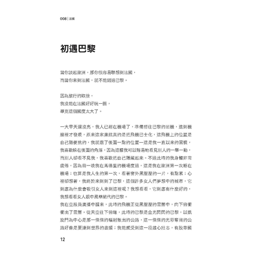 一大早天還沒亮,我人已經在機場了,準備搭往巴黎的班機,進到機艙裡才發現,原來這家廉航真的是把飛機巴士化,這飛機上的位罝是自己隨便挑的,我就選了後面一點的位置—這是我一直以來的習慣,我喜歡躲在後面的角落,因為這樣我可以輕易地看見別人的一舉一動,而別人卻看不見我,我喜歡把自己隱藏起來。不過此時的我身體非常疲倦,因為前一晚我在馬德里的機場度過,這是我在歐洲第一次睡在機場;也算是我人生的第一次,看著窗外黑壓壓的一片,有點累;心裡卻想著,我終於來到到了巴黎,這個許多女人們夢想中的城市,它到底為什麼會吸引女人來到這裡呢?我想看看,它到底有什麼好的,我想看看女人眼中風華絕代的巴黎。