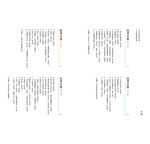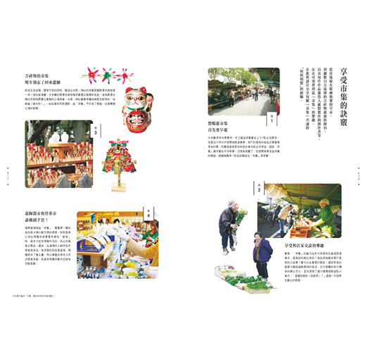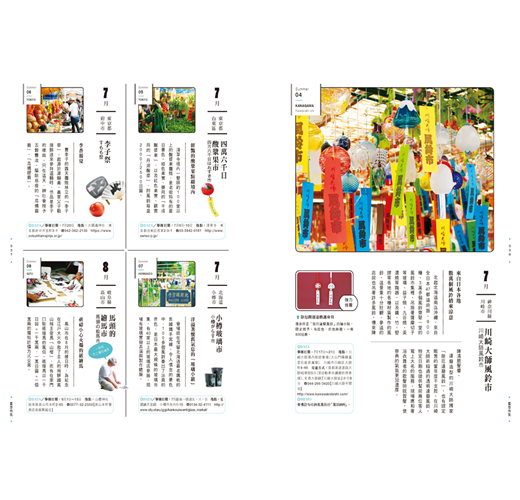 總覽日本全國四季的市集風情將四季特色市集、朝市與手創市集分類歸納,在旅途的過程中,稍微繞道一下前往市集,有與日常生活息息相關的花市、陶器市、玻璃市集、二手書市集、手創市集,也有充滿季節風情的朝顏市、金魚祭和風鈴市,喜歡古物的人更是不能錯過骨董市集,充滿緣起物帶來好運的酉之市、羽子板市、與達磨市等,四周滿是活力吆喝聲的朝市,還有許多飽含創作者心意的手創市集,只要你喜歡在市集中探索新樂趣,只要你也喜歡與新事物碰撞的感動,就一起來市集逛逛吧!