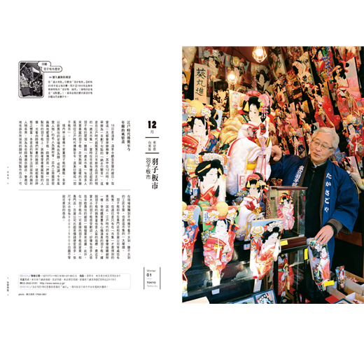 於歲末除厄的「羽子板市」,是從江戶時代延續下來的季節性風情,有以歌舞伎的當紅人物為主題的款式,也有描繪藝妓栩栩如生表情的華麗羽子板,與店家詢問製作方法,探索前所未見的事物,正是逛市集的醍醐味所在。成為吉祥物代表的「七草大祭達磨市」,紅色的不倒翁外觀帶來濃濃的福氣與好運,街上有許多抱著達磨不倒翁來往的人潮,心中懷著各樣的願望。