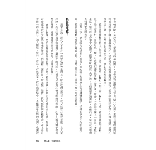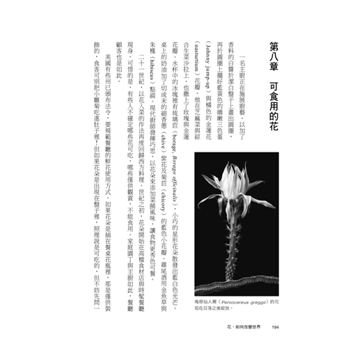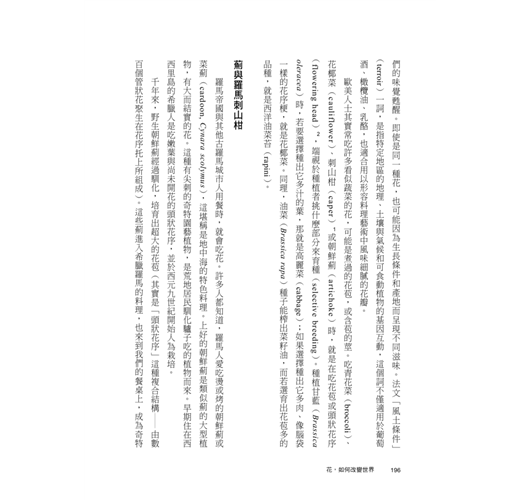 根莖「花」果葉籽芽,在植物器官之中,為什麼唯獨花是如此詩意的存在?人類愛花的行為委實奇怪,難道花是生活的必需品嗎?除了賞花,又為何要種花、買花、為花命名又千方百計改變花的生長方式?在美感的享受之外,花又給人類的農業、商業、文化生活留下了什麼影響?園藝師傅、藝術家、科學家、調香師以及廚師又怎麼看待生活中的花?