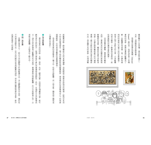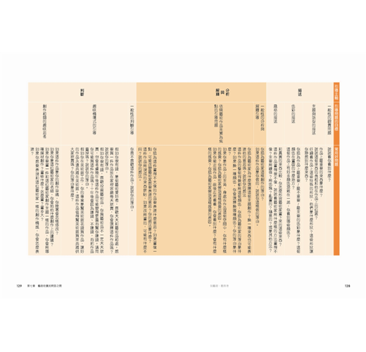 另外一大重點是,如何從欣賞到思考,所以作者不僅提供了學理上的藝術鑑賞方法,還有直覺式的藝術鑑賞討論,有方法就不會言之無物;同時,還要從練習中學會描述、分析、解釋、判斷。