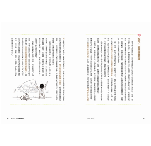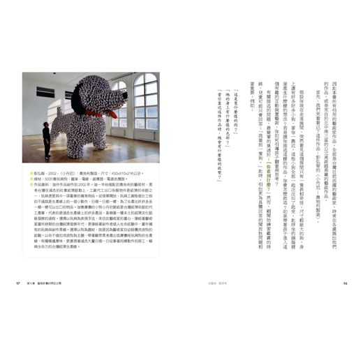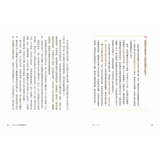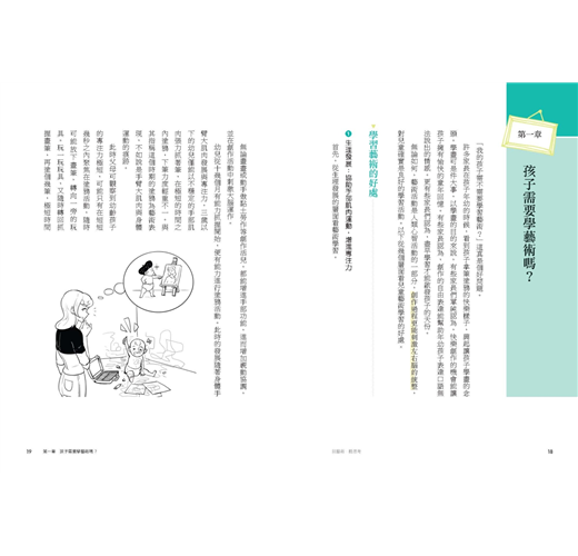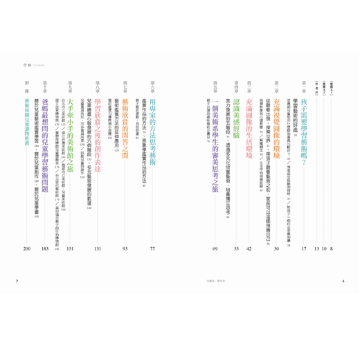 於是,她以專業的角度,搭配身為母親的貼心,提供理論與實務作法,圖文並茂地讓家長了解孩子多大可以開始學藝術、談環境中可見的各種視覺藝術,包括家中可見之報章雜誌的圖像呈現,兒童圖畫書中的插畫作品,家中各類物品的設計性等,進而談到走出家門處處有藝術,最後談到走入相關場域,例如美術館等地。以及在和孩子談藝術之前,大人必須先解構自己對美術的想法、接納孩子對美術的多元觀點,然後必須共同欣賞與討論。