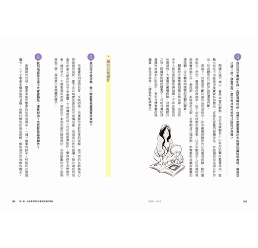 最後一章則會回答一些教育現場中,父母最想問與經常問到的問題,如:如何鼓勵孩子更喜歡欣賞藝術?我的孩子愛畫畫,需要怎樣幫他準備繪畫媒材?我的孩子愛塗鴉,需不需要教他畫寫實具象物?我的孩子不會用固有色,怎麼教他認識顏色,並且用正確的顏色畫畫?老師誇獎我的孩子有天份,是否該讓他去讀體制內的美術班….等等問題,書中都有詳盡的解說。
