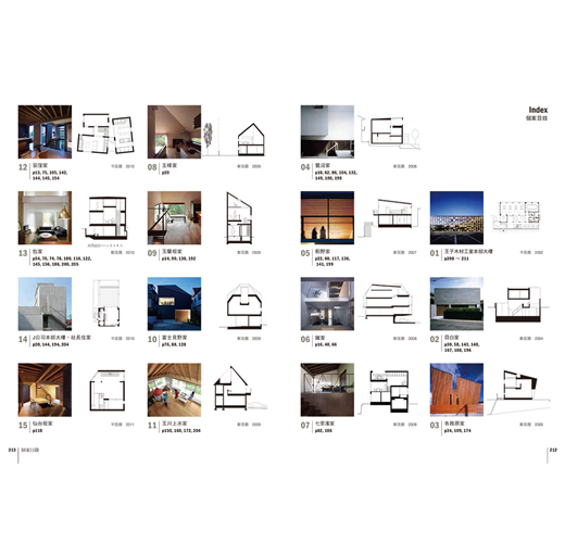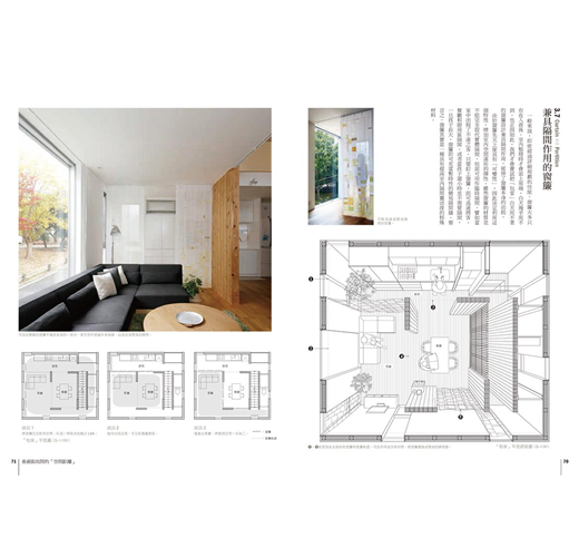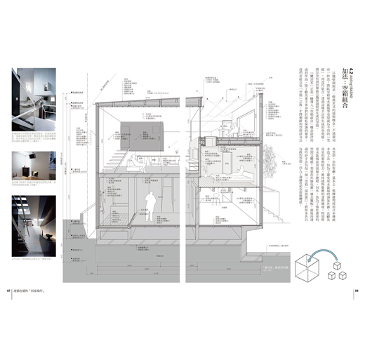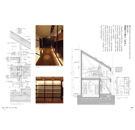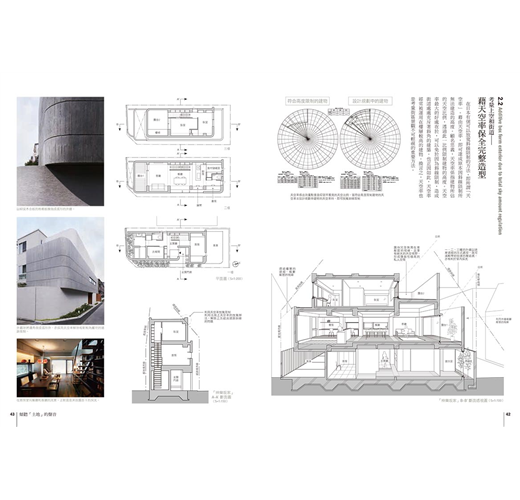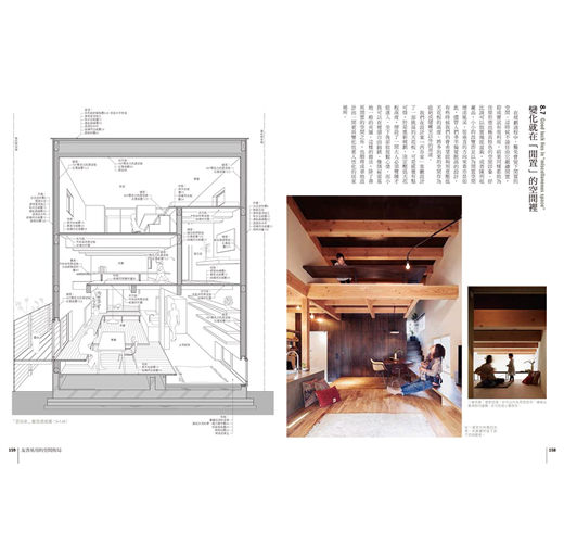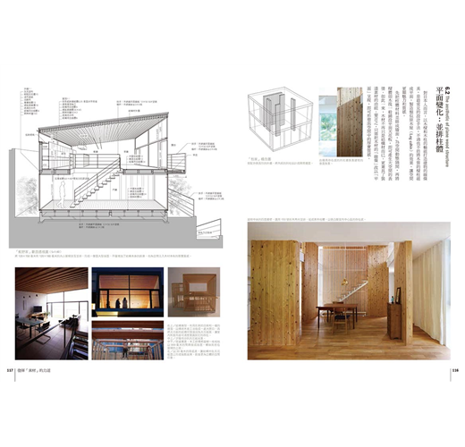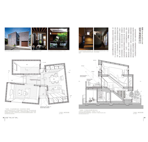 書中,作者大方公開執業多年的個案,以實際圖片,搭配大量的專業「斷面透視圖」,不只逐一標示基地形態、尺度規格、結構與素材……等,更在重點設計上拉線,深入說明設計概念與想法。此外,除了充滿力道的建築體本身,還可從書中看到,兩位建築師如何大玩地板結構:錯層樓板、雙層地板……讓居家產生起伏變化,同時也創造以地為桌的書房、降板內嵌的客廳等趣味的室內景色。