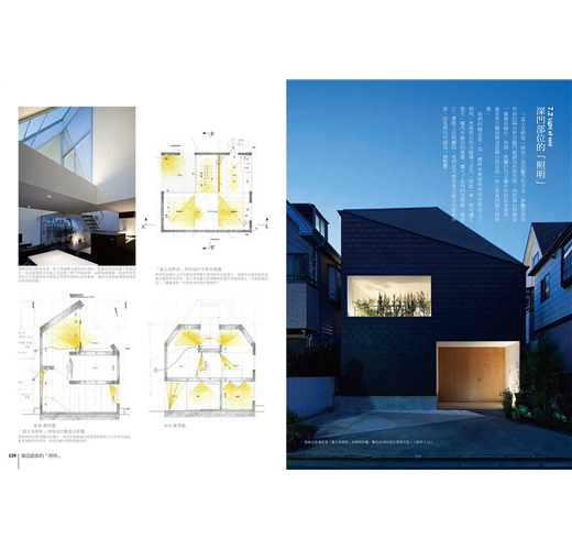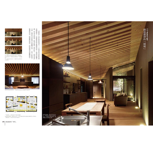 針對燈光,也佐以圖示,羅列出11種運用於居家的照明設計,如:最小限度的照明、深凹部位的照明、由間隙透出的照明、反射的照明……透過圖像與線條、各種數據資料,與讀者進行交流對話,讓人們可以徹底理解一棟建物的身世背景。