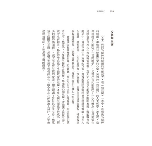 生為精神科醫師世家的齊藤茂太曾說,他的父母是水火不容的兩個極端,而且雙方都有燥鬱症精神病史,從小在衝突不斷的家庭中成長,戰後又於陸軍醫院擔任精神科醫師,這些經驗讓他看盡了人生貪瞋痴。茂太認為,要讓自己從苦海解脫,唯有像豆腐般融通無礙,才能如金剛經說的「應無所住而生其心」。茂太生前指定說,當他臨終時,想吃他畢生最敬愛的豆腐,希望豆腐引領他成為「四角四面的佛頂面」。