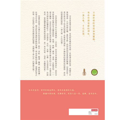 作者為旅日手作生活實踐家──洪金珠,崇尚日本發酵飲食多年,研究日本廚房裡必備的各式釀造調味,味噌、味醂、醬油、清酒、米麴等物,一一親手釀製,深得和食調味的奧妙精華,以及萬變不離其宗的心法。本書收錄各式調味料的釀製配方,也從歷史、文化、文學、心靈、生活等面向,詳細考究,幫助讀者了解和風料理精神,是一本文化考,也是一本釀造祕笈。