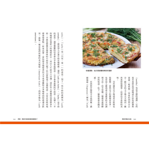 在西班牙咖啡可分成四種。濃縮咖啡(Espres so)稱為「Café solo」。「solo」是「只有、單一」的意思。加了一些牛奶的就稱為「café cor tado」,就是加入少量牛奶在咖啡裡。還有「café con leche」,「leche」是牛奶的意思,通常餐廳的侍者會右手拿著咖啡壺、左手拿著溫熱的牛奶壺,先倒入一半的咖啡在寬杯口的咖啡杯中,再注入牛奶至八分滿。或許有人會覺得加那麼多牛奶,不就是稍微有咖啡味的牛奶而已嗎?但只要熟悉了這個味道,不管在何時何地都會想要點一杯來品嘗。當你想念咖啡香但又不希望攝取太多咖啡因時最適合飲用。最後一種是我們熟知的美式咖啡(American Cafe),在西班牙稱為「café americano」。