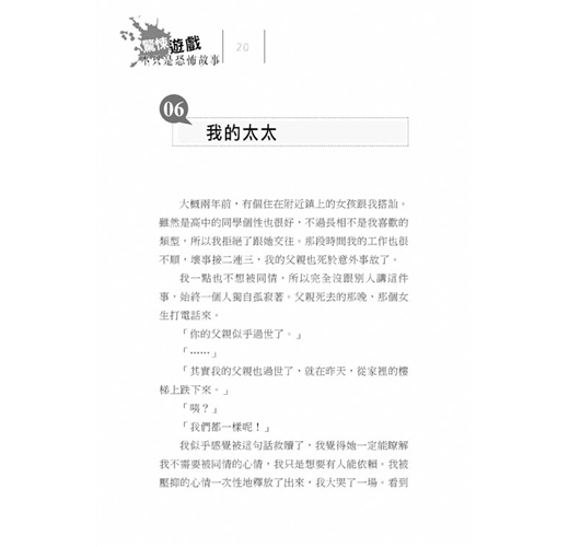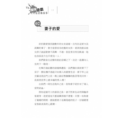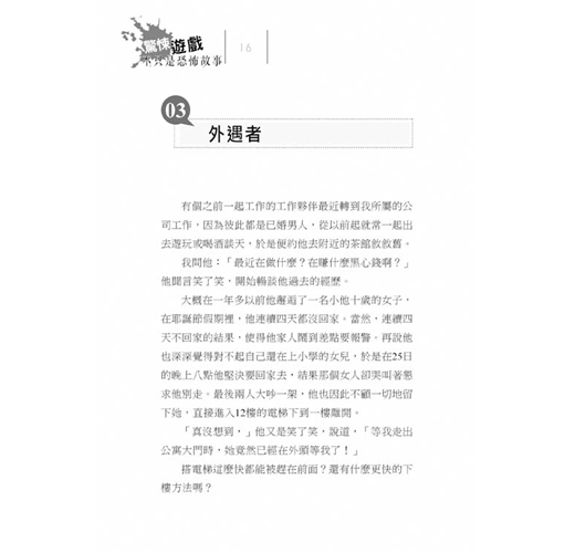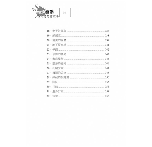 好了,現在你最應該做的就是翻過本頁,快快進入正文,到驚悚遊戲中去尋找刺激與不一樣的人生吧!