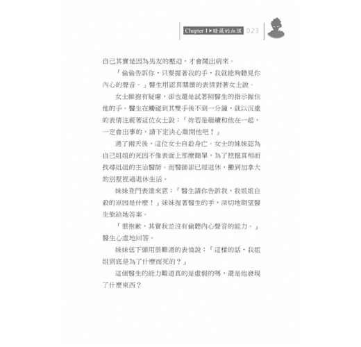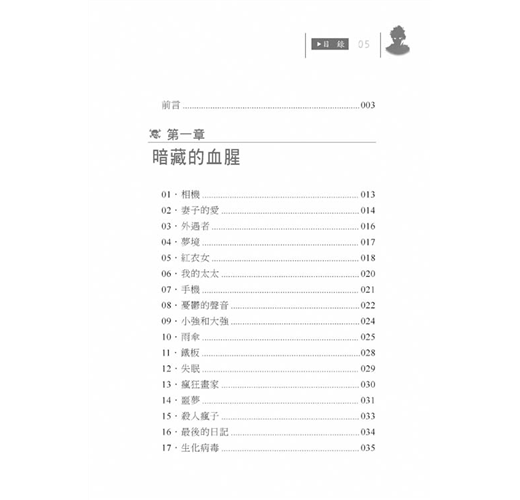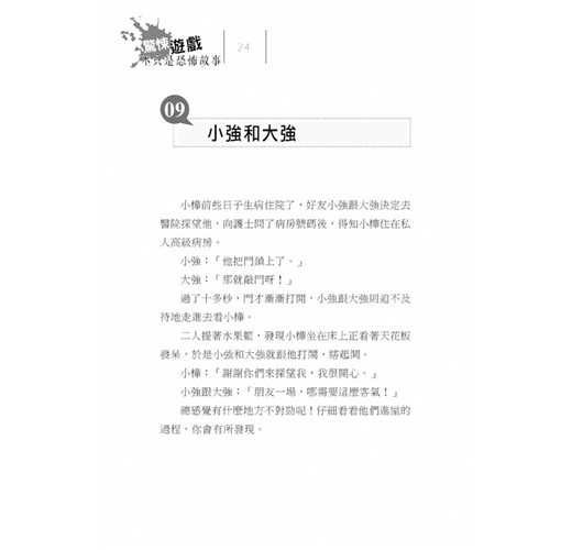為了保持閱讀的神祕感,不要過早「劇透」,特別注意在每個故事敘述到結尾時提出問題,然後將事情的真相放在最後一章「答案」中。讀者朋友們在讀到問題時,不妨先合上書本思考一下,給出一個自己的答案,然後再去看答案,相信這樣,才能最大程度地享受到「我猜到了驚悚背後的真相」所帶來的快感。