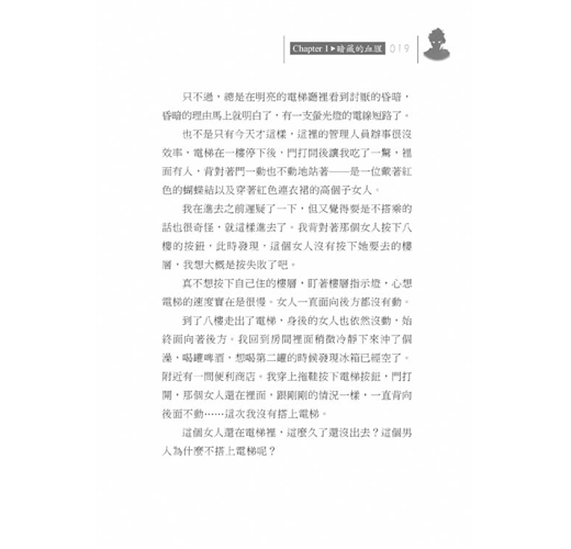 到了八樓走出了電梯,身後的女人也依然沒動,始終面向著後方。我回到房間裡面稍微冷靜下來沖了個澡,喝罐啤酒,想喝第二罐的時候發現冰箱已經空了。附近有一間便利商店。我穿上拖鞋按下電梯按鈕,門打開,那個女人還在裡面,跟剛剛的情況一樣,一直背向後面不動……這次我沒有搭上電梯。
