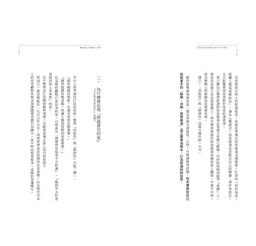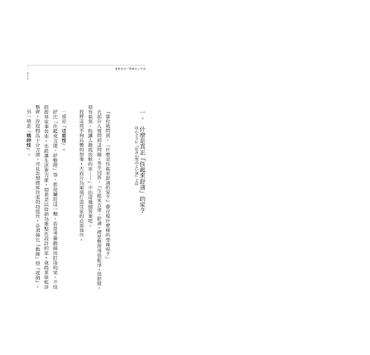 我之所以想寫這本書,就是想幫助那些還在遷就居住環境的人們,重新檢視自己的家,重新設定自己對於家的想法,打造「有自我風格的家」、「住起來很舒適的家」。要說我有什麼期望,那就是我想打造不只自己住得舒適,還能「讓別人樂於造訪」的家。本書以淺顯易懂的文字說明構成住宅的三大要素,「動線」、「收納」、「居家裝潢」。