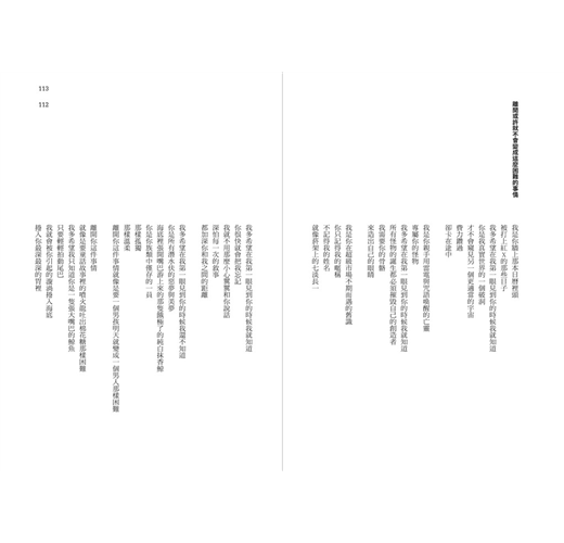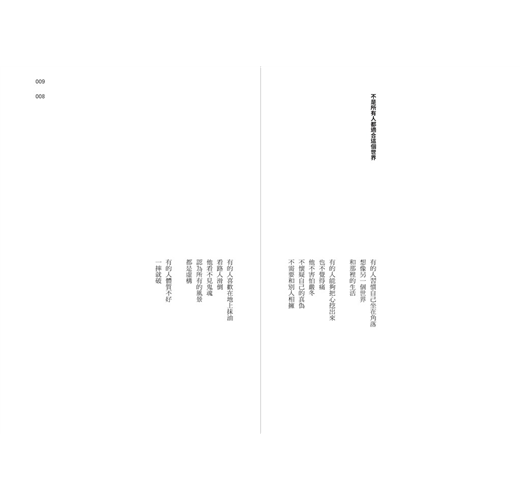 認為寫詩這一回事,有時候是這樣的:所有的詩,都不是寫給你的,你讀了,你以為就是寫給你的。但其實不是,沒有人在乎你。而有時候寫詩也會是這樣的:所有的詩,都是寫給你的,你讀了,你以為是寫給別人的。但其實不是,我只願意在乎你。