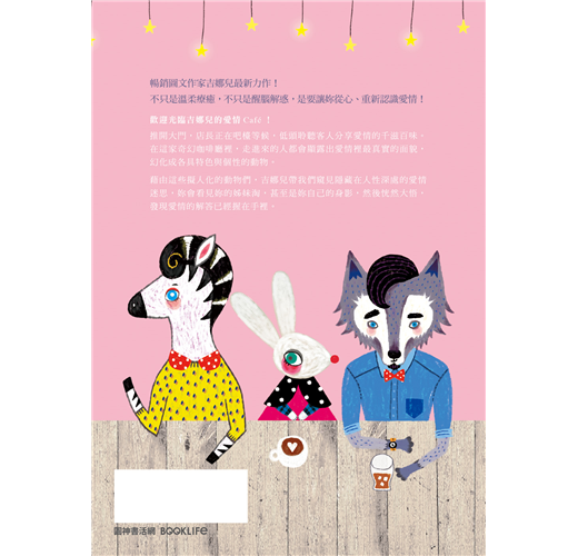 就像這樣,我們在聽別人的故事的時候,尤其聽身邊的朋友分享感情問題,總可以明確地發現問題與盲點,卻對自己的愛情常常束手無策。我想藉由閱讀別人的愛情故事,應該能夠幫助大家從中發現自己的盲點,甚至找到自己解不出來的答案,因此開始創作《吉娜兒的愛情Café》,希望能協助大家愛得更好。《吉娜兒的愛情Café》是一間奇幻咖啡廳,走進來的人都會顯現出在愛情裡的本性,變成不同的動物,奇幻地呈現不同的愛情模樣。希望正在翻看的妳,可以買一本放身邊,隨時光顧這間心靈裡的咖啡廳,和我一起喝咖啡、聊愛情,找到專屬於自己的愛情模樣。如果妳的朋友也會為情所困,請再買一本送給她。