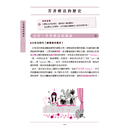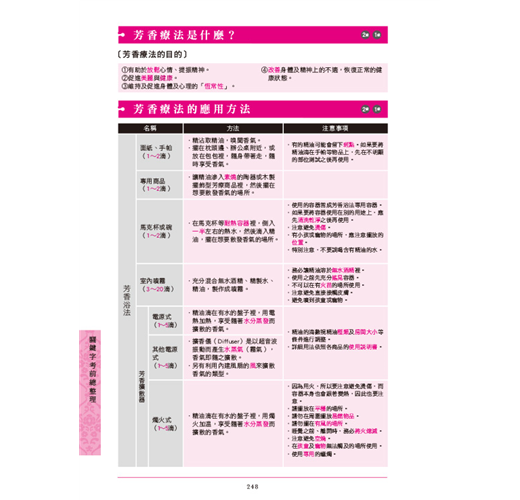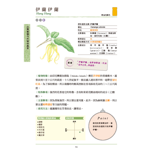 囊括重要精油的詳細介紹,從辨識到應用,內容深入淺出,再加上彩圖解說芳香療法的基礎知識,將芳療鉅細靡遺地介紹給讀者,除了作為考試用書,亦是一本十分值得詳讀的芳療百科。