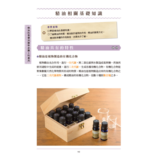 精油是施行芳香療法不可或缺的物質。精油具有的特性、製造萃取方式以及對於身心的作用機制與對間康的關聯性若能一併了解,在學習考試或生活運用上都如虎添翼事半功倍。