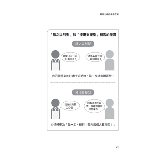 重要的是,要使得心態上覺得「跟我沒關係、沒興趣、不想理」,徹底漠不關心、拒絕溝通的對方,能夠願意聽自己準備好的「打動客人的理由」。如此一來,敲開了對方的心防,讓顧客更靠近你,最後,對方一定會如你所願,採取你所期望的行動。