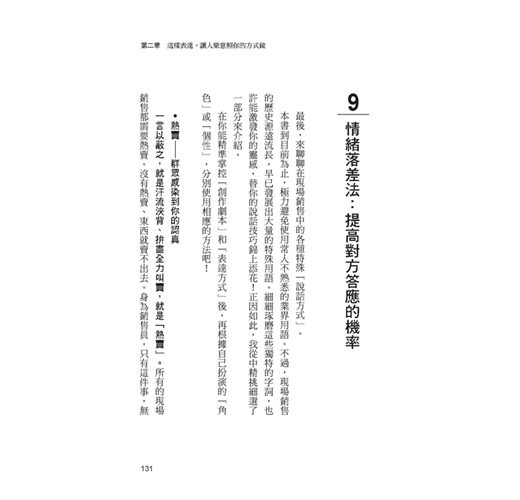 接下來,重點來了!「讓人忍不住為你著想」的表達方式、「精準指出商品優勢之處」的說明能力,還有「吸引周遭目光」的空氣營造術,所有條件終於備齊了。接著就以這三項要素為基礎,讓我告訴各位「打動人心」的具體溝通技巧。