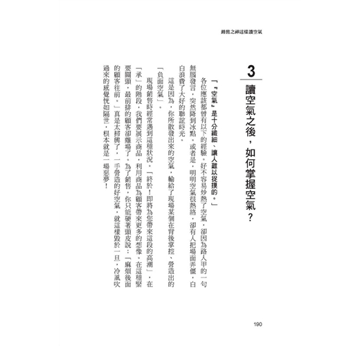 這項武器,正是運用在現場銷售訣竅中的——讀空氣(源自日本女高中生的用語——「不會讀空氣」,形容人不會觀察氣氛、狀況外)。