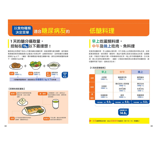 第2章依醣分高低列出常吃的料理,包括蛋包飯、牛排、麻婆豆腐等,可依需求選擇主菜、配菜及湯品,例如正在減醣的人若要喝湯,只要查閱本書就可知道,喝味噌湯比酸辣湯更好,避免誤食高醣食物。