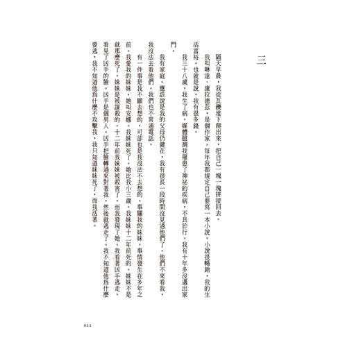 近來我鮮少作夢。我從滾滾紅塵隱退的頭幾年,作的夢是前所未有的鮮活,彷彿我的頭腦想要補償日間接收不到的新刺激,它為我創造了最多彩多姿的歷險——熱帶雨林裡會說話的動物;豔麗的彩色玻璃打造的城市,居民個個有魔法。可是,儘管我的夢一開頭總是明亮愉快,遲早都會變暗,像是一張吸墨紙,紙上的黑墨會逐漸擴散。雨林中的樹葉會枯落,動物不再說話。玻璃變得極銳利,會割傷手指;天空也變成黑莓色。而且他會出現——那頭怪獸。有時只是隱隱一股脅迫感,言語無法形容;有時是條朦朧的形影,隱伏著,幾乎看─不見。偶爾他會追逐我,我會奔逃,盡量不回頭看,因為我受不了看見他的臉,即便是在夢裡。只要我凝目看著那頭怪獸,我都會死——死了,然後清醒,每一次,都大口喘氣,像溺水的女人。而在那頭幾年,夢仍不放過我,我很難驅離那些在夜晚湧現,並且像烏鴉停棲在我床上不走的思緒。我束手無策;無論回憶有多痛苦,在那些時刻,我都無法不去想她,不去想我的妹妹。