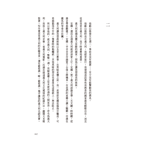 地動山搖發生在週二,事前並沒有微震——至少沒有能驚動我的徵兆。地動山搖時我在義大利。我經常旅行。我發現造訪那些我熟悉的國家最是輕鬆自在,況且從前我常去義大利,我不時會舊地重遊。義大利是個美麗又危險的國家,因為它讓我想起我的妹妹。安娜,還沒去過義大利就深深愛上它;安娜,買了義大利語錄音帶,天天聽,時時聽,把錄音帶都聽壞了。安娜,辛辛苦苦存錢買了台偉士牌機車,在我們的家鄉小鎮上馳騁,彷彿在羅馬的窄巷中狂飆。義大利讓我想起妹妹以及昔日舊事,在黑暗來襲之前。我一直想把安娜從腦海中驅逐,可是她黏得牢牢的,像舊時的黏蠅紙。其他黑暗的想法也會落在這張紙上,無法阻止。所以管他的,就去義大利。整整一週,我躲進樓上從未使用過的三間客房,命名為義大利。我放上義大利音樂,看義大利電影,沉溺在描述義大利文化風情的紀錄片中,翻閱大本精裝書,叫外賣送來義大利的珍饈美食,還有葡萄酒。喔,葡萄酒,幾乎讓我的義大利名副其實。