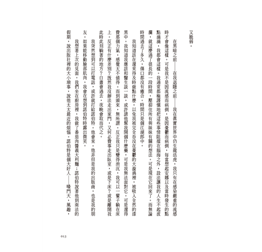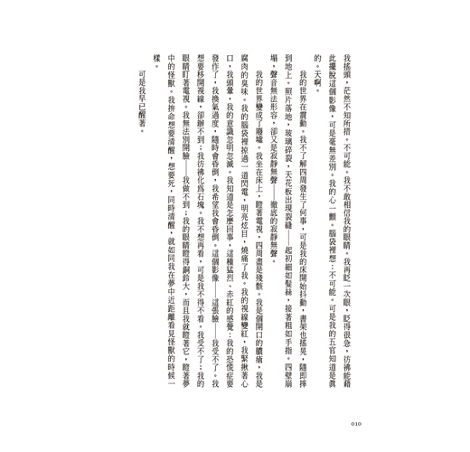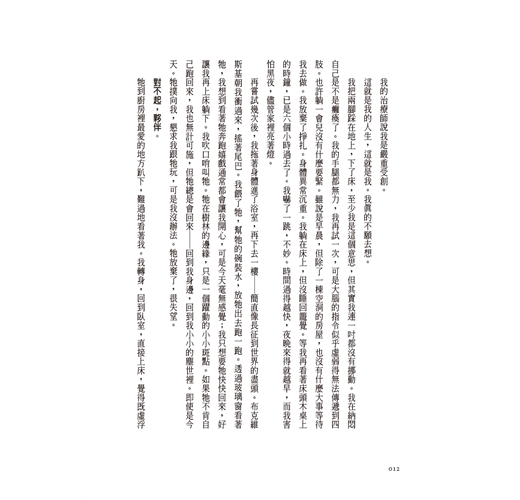 我知道該在還來得及時做點什麼,以免我被完全吞沒在憂鬱的大漩渦裡,被吸入全然的漆黑中。我知道我應該和醫生談一談,或許請他幫我開個什麼藥,可是我無法面對它。可是還得費那個力氣,感覺太不值得。而到頭來,無所謂。反正我只是變得消沉,我可以一輩子躺在床上。反正有什麼差別?既然我沒辦法走出家門,又何必費事走出臥室,或是下床?或是離開我此時此刻躺著的地方?白晝會過去,夜晚會取而代之。