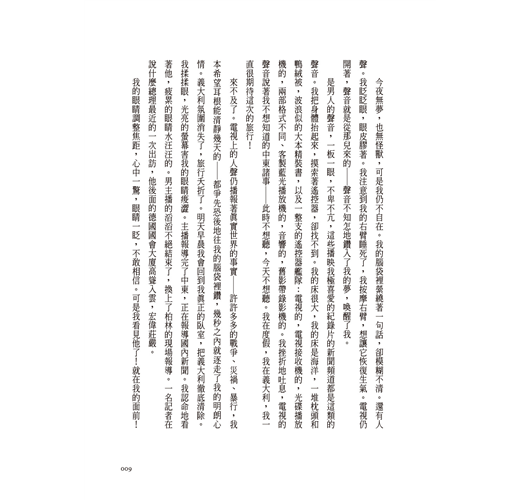 是男人的聲音,一板一眼,不卑不亢,這些播映我極喜愛的紀錄片的新聞頻道都是這類的聲音。我把身體抬起來,摸索著遙控器,卻找不到。我的床很大,我的床是海洋,一堆枕頭和鴨絨被,波浪似的大本精裝書,以及一整支的遙控器艦隊:電視的,電視接收機的,光碟播放機的,兩部格式不同、客製藍光播放機的,音響的,舊影帶錄影機的。我挫折地吐息,電視的聲音說著我不想知道的中東諸事——此時不想聽,今天不想聽。我在度假,我在義大利,我一直很期待這次的旅行!