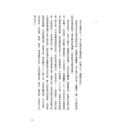 現在是秋天,我佇立眺望,感覺像在照鏡子。色彩由淡轉濃,層層敷設;秋風吹得樹木搖曳,吹彎了一些枝椏,也吹斷了幾根樹枝。今天是很美、很濃豔的一天。大自然似乎也覺察到有什麼事即將落幕,因此凝聚起全身之力,要做最後一次的激湧。不久之後,我窗外的景致就會了無生氣。日光會變為濕濕的灰色,然後是易脆的白。來看我的人——我的幫手、我的出版商、我的經紀人(也是僅有的一個)——會抱怨濕氣太重,溫度太低。抱怨他們必須用麻木的手指刮擋風玻璃之後才能出發,抱怨他們─早晨離家時天色仍暗,晚上回家時仍得摸黑。這些事都與我無關。在我的塵世裡,無論冬夏,都是攝式二十三點二度。在我的塵世裡,只有永晝,沒有黑夜。在這裡,無雨,無雪,無凍僵的手指。在我的塵世裡,唯有一個季節,而我至今仍無以名之。