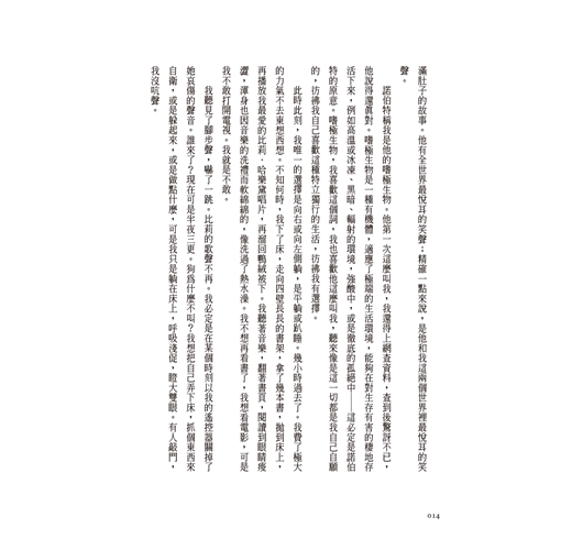 諾伯特稱我是他的嗜極生物。他第一次這麼叫我,我還得上網查資料,查到後驚訝不已,他說得還真對。嗜極生物是一種有機體,適應了極端的生活環境,能夠在對生存有害的棲地存活下來,例如高溫或冰凍、黑暗、輻射的環境,強酸中,或是徹底的孤絕中——這必定是諾伯特的原意。嗜極生物,我喜歡這個詞,我也喜歡他這麼叫我,聽來像是這一切都是我自己自願的,彷彿我自己喜歡這種特立獨行的生活,彷彿我有選擇。