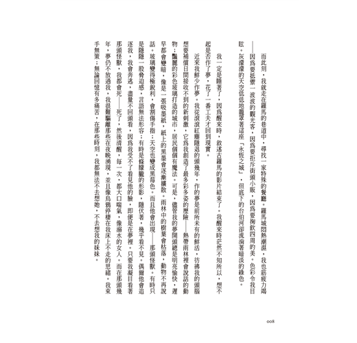而此刻,我就走在羅馬的巷道中,尋找一家特殊的餐廳。羅馬城悶熱潮濕,我也筋疲力竭──因為要抵禦一波波的觀光客,因為要拒斥街頭小販,因為要掬飲四周的美。色彩令我目眩。灰濛濛的天空低低地籠罩著這座「永恆之城」,但底下的台伯河卻流淌著暗淡的綠色。