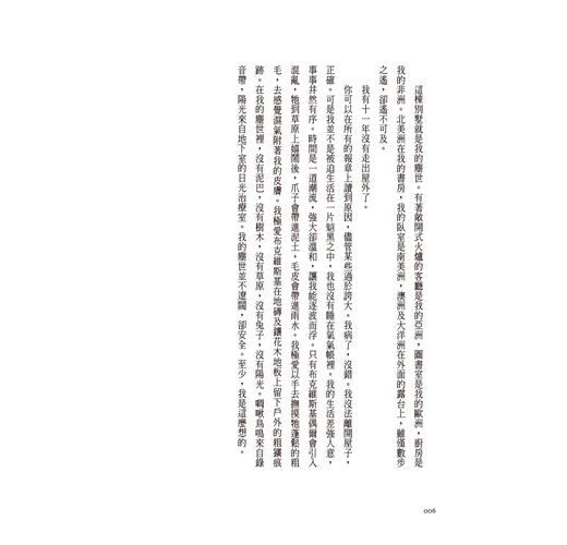 你可以在所有的報章上讀到原因,儘管某些過於誇大。我病了,沒錯。我沒法離開屋子,正確。可是我並不是被迫生活在一片魆黑之中,我也沒有睡在氧氣帳裡。我的生活差強人意,事事井然有序。時間是一道潮流,強大卻溫和,讓我能逐波而浮。只有布克維斯基偶爾會引入混亂,牠到草原上嬉鬧後,爪子會帶進泥土,毛皮會帶進雨水。我極愛以手去撫摸牠蓬鬆的粗毛,去感覺濕氣附著我的皮膚。我極愛布克維斯基在地磚及鑲花木地板上留下戶外的粗獷痕跡。在我的塵世裡,沒有泥巴,沒有樹木,沒有草原,沒有兔子,沒有陽光。啁啾鳥鳴來自錄音帶,陽光來自地下室的日光治療室。我的塵世並不遼闊,卻安全。至少,我是這麼想的。