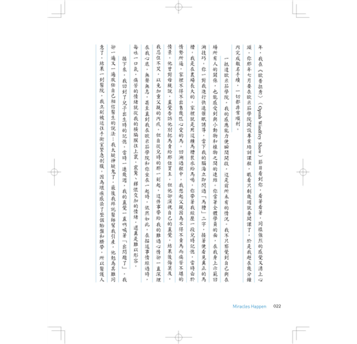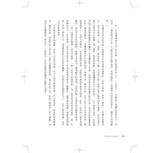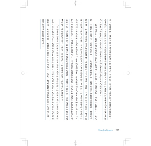 沒錯,有時奇蹟就是會發生。可能是影響整個團體的大奇蹟,也可能是悄然來去的小奇蹟。無論規模大或小,它所造成的改變都是永遠的:人際關係修復了,靈魂獲得滋養,得到嶄新、更具有深刻意義的生活。總之,奇蹟發生了。
